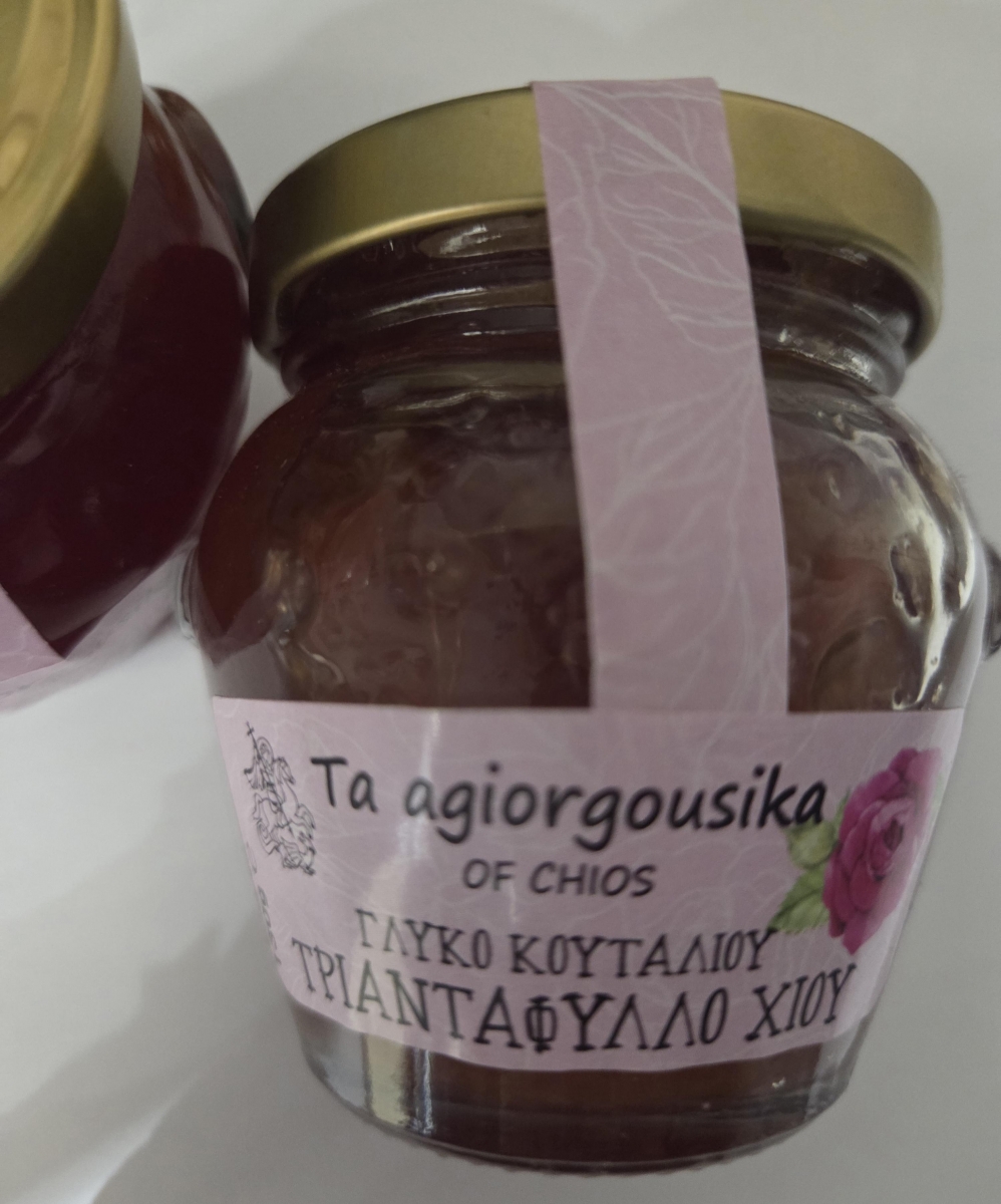 Rose spoon sweet is made with a traditional homemade recipe, without colorings or preservatives. It is a sweet with a distinctive taste and aroma. It is traditionally offered as a dessert or accompanies ice cream or yogurt.