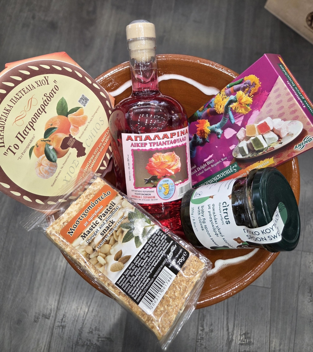 Η σαλατιέρα περιέχει: 1 λικέρ τριαντάφυλλο Απαλαρίνα 500ml, 1 γλυκό συκαλάκι με μοσχοκάρφι 250g Citrus, 1 λουκούμι κοκτέιλ, 1 πίτα μανταρίνι με αμύγδαλο & 1 μαστιχοπάστελο με αμύγδαλα.